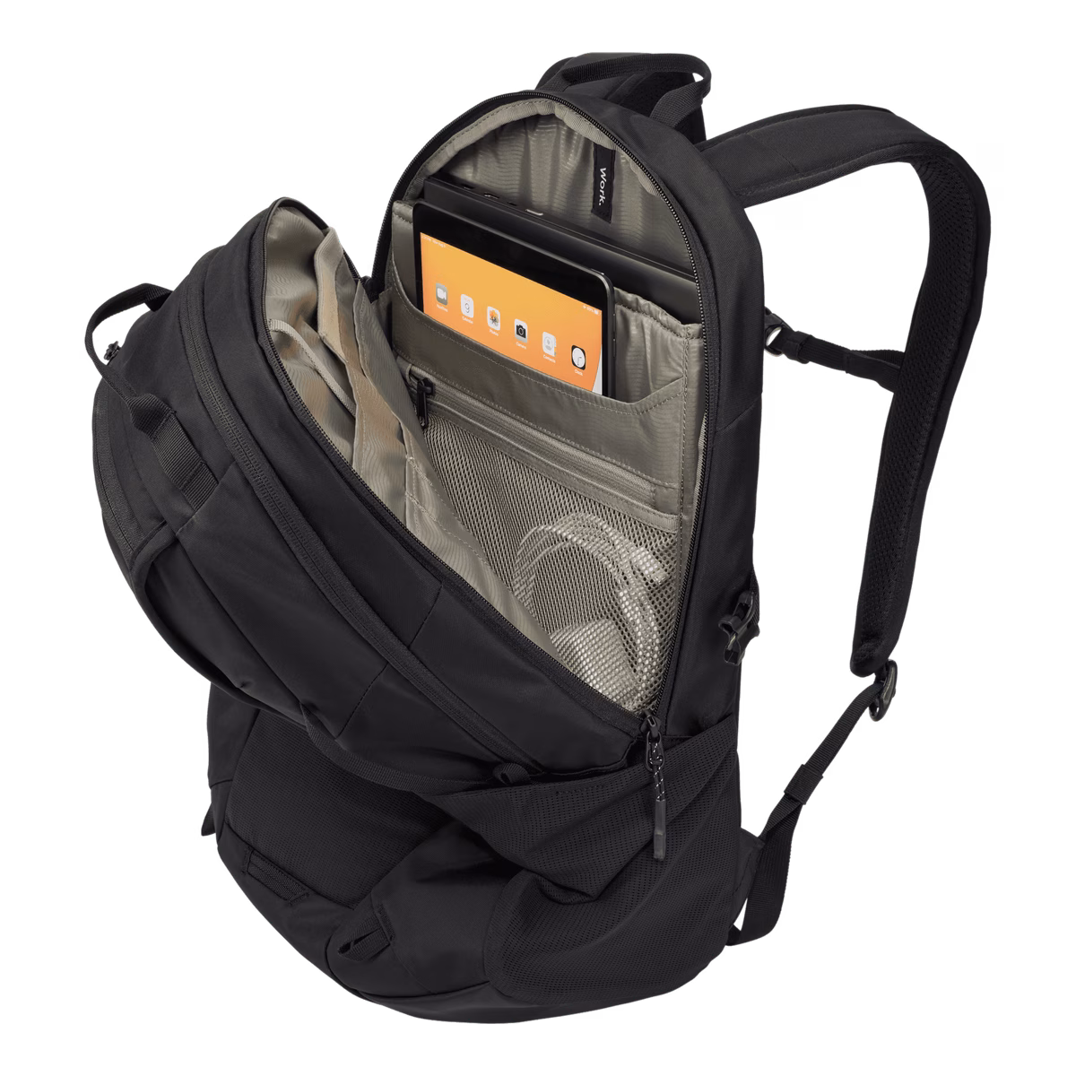 Elevated, dedicated pockets protects up to a 16 laptop and up to a 10.5″ tablet”